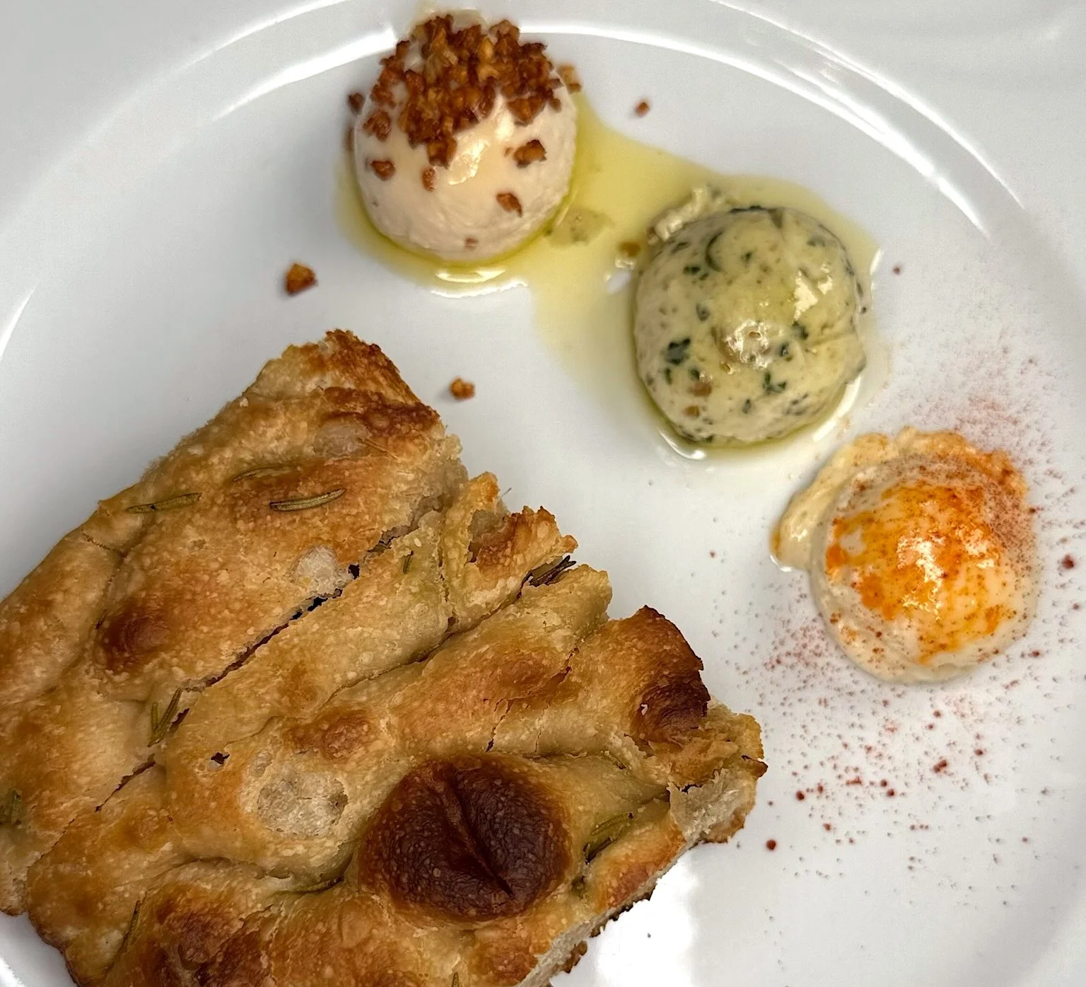 The rosemary sourdough focaccia is new and permanent. It arrives with three compound butters: Filipino adobo topped with crunchy fried garlic, Italian pesto finished with extra virgin olive oil, and Spanish Manchego and honey dusted with paprika. Three heritages, on one plate, before anything else has arrived at the table.